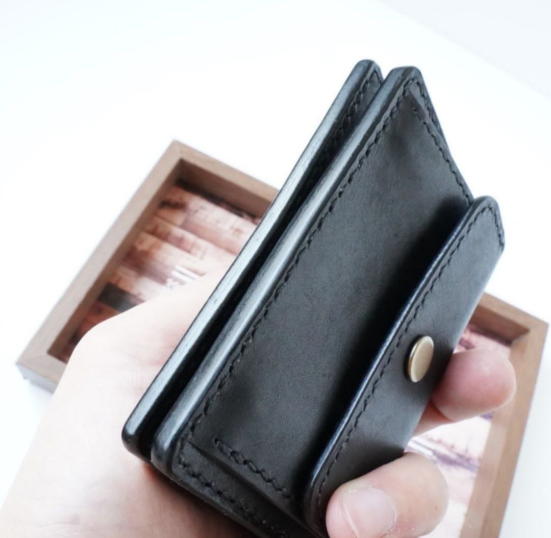 Leather key accessory size: 8cm x 12cm with 5 small metal carabiners and a hidden pocket for a card or money. Closes with a button